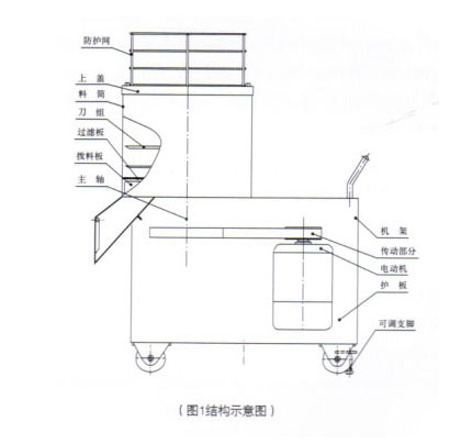 2.1主要結(jié)構(gòu) 本機(jī)主要有機(jī)架、傳動部分、刀組、過濾板、撥料板等結(jié)構(gòu)組成。(參見圖1主要結(jié)構(gòu)簡圖)